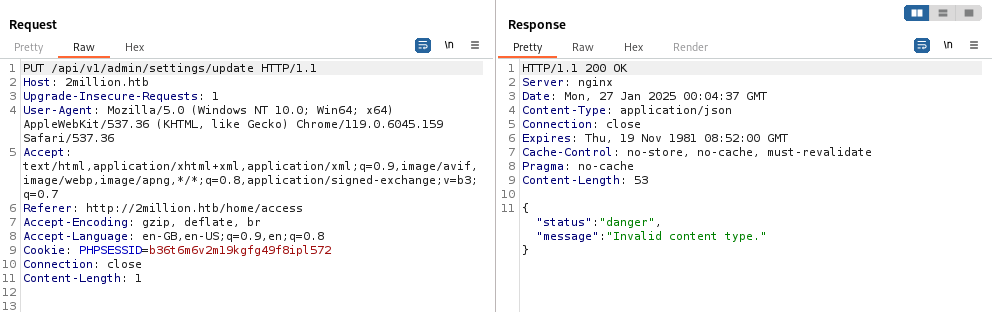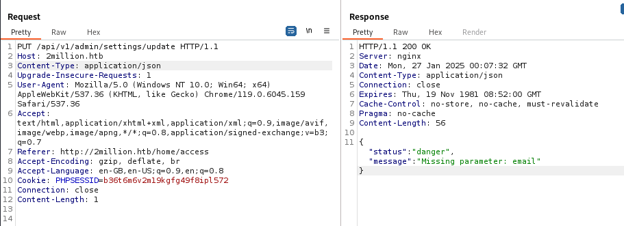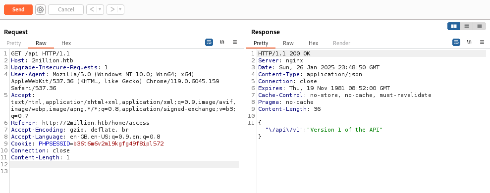 and from the output we can see that it did not follow the redirection to http://2million.htb/ which indicates the domain name is 2million.htb.
