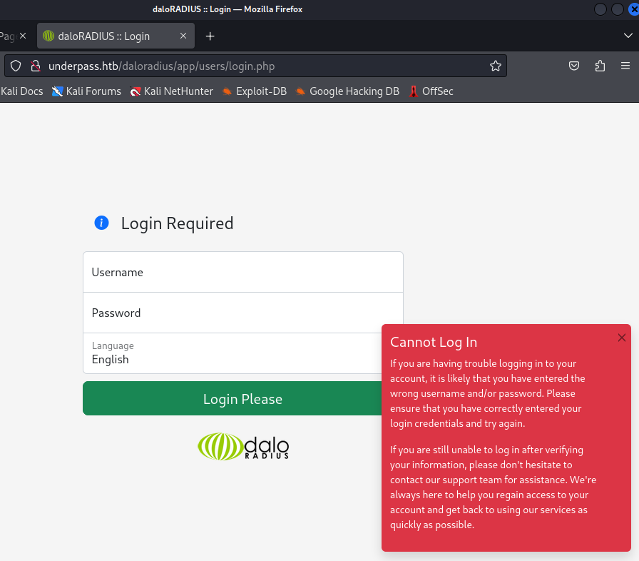 Upon visiting the page, we were redirected to http://underpass.htb/daloradius/app/users/login.php since we are not authorized yet. It is a page where we can log in. I tried the default credentials for daloradius: administrator:radius but did not work.
