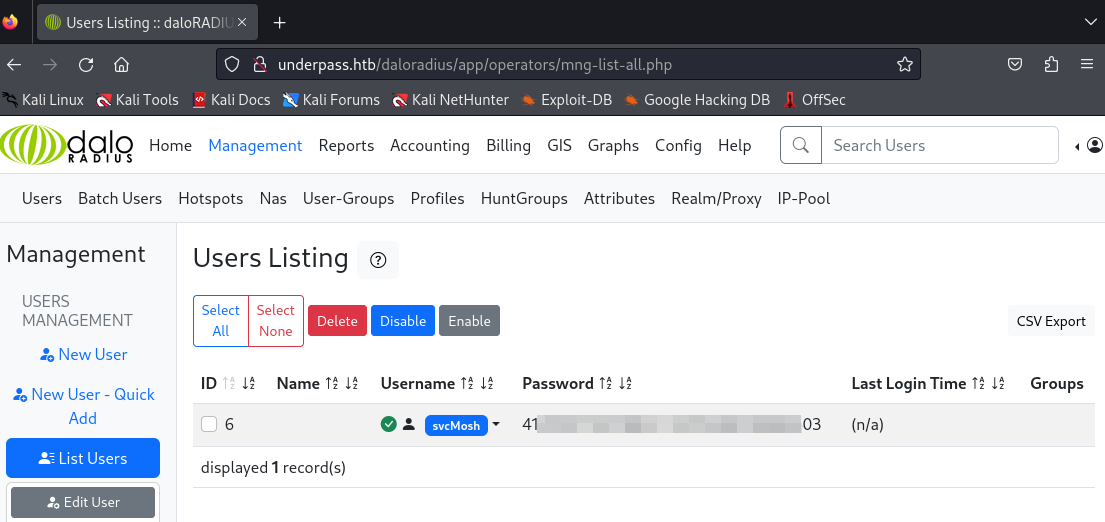 Under the Management tab, when you list the users, we can see a user with its username and hashed password.